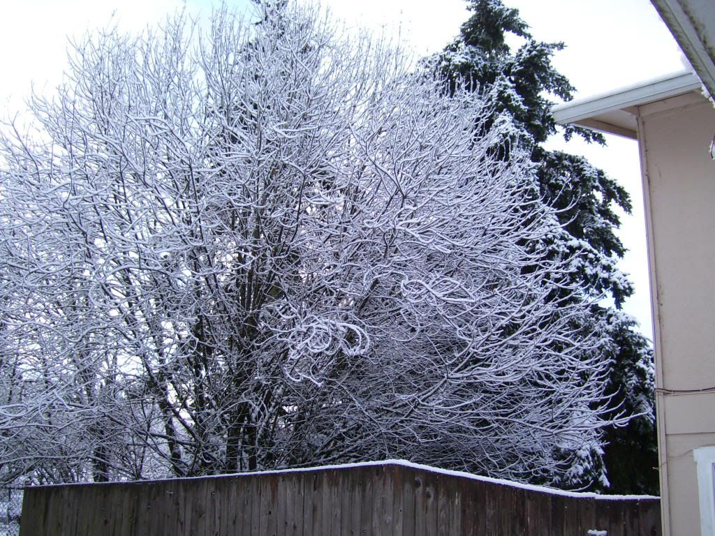 Well, it snowed about 8 to 10 inches yesterday. Virtually all day yesterday. It was truly amazing and not something I've seen like this since we've lived in Portland. By end the end of the day travel became much more difficult. Then during the night we got some freezing rain to cover the the snow - so this morning there was about an 1/8th of an inch of ice covering all the snow. So everywhere you walk is crunchy and slick - and really pretty cool if you don't have to drive anywhere. I've added some pictures that I thought might demonstrate the effect.